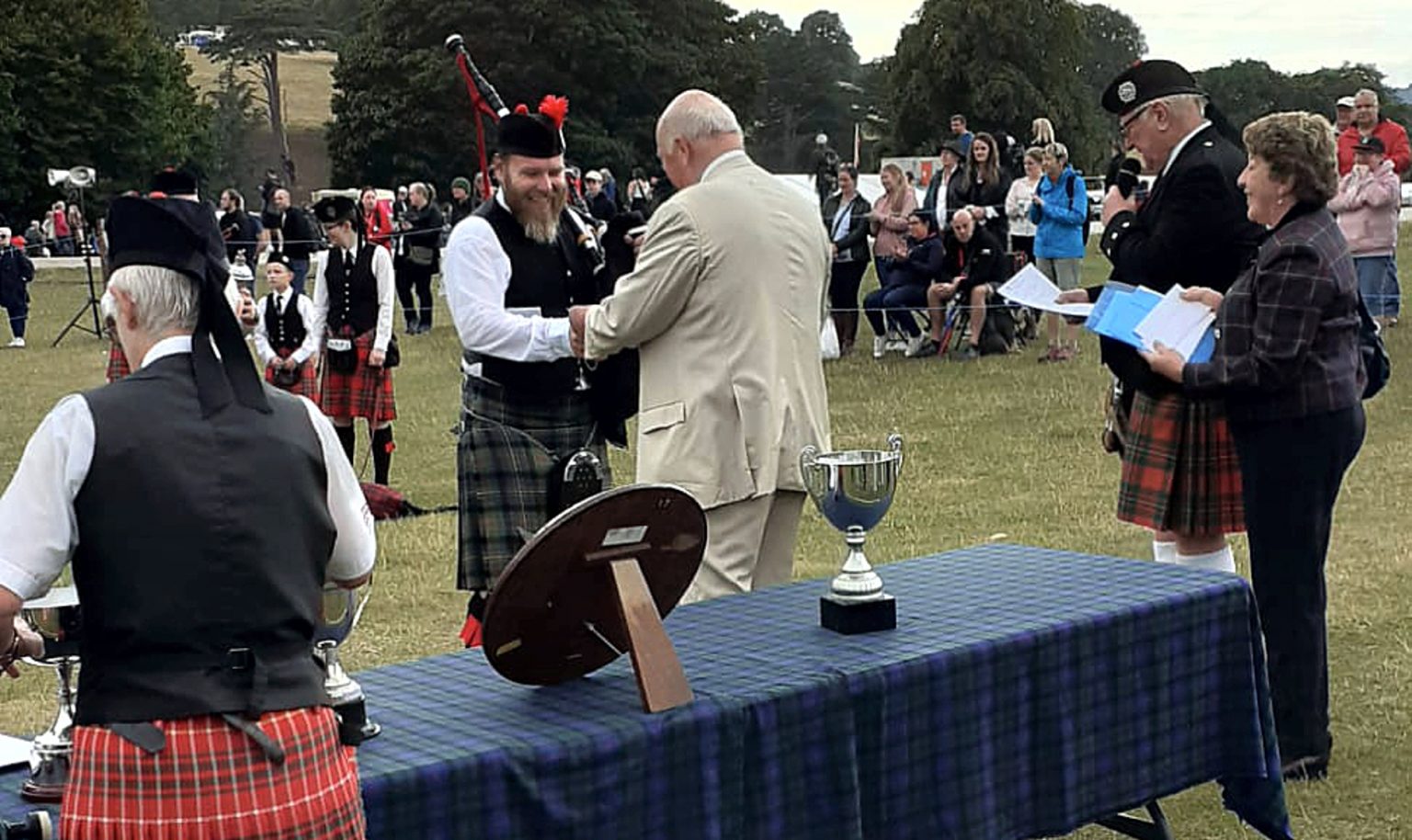P/M Jonathan Imrie collecting one of several prizes won at the 2022 Chatsworth House Pipe Band Competition